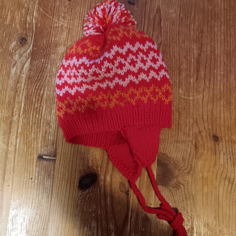 Neulottu villalapipo lapselle, punaruskeavalkoinen kuviolla