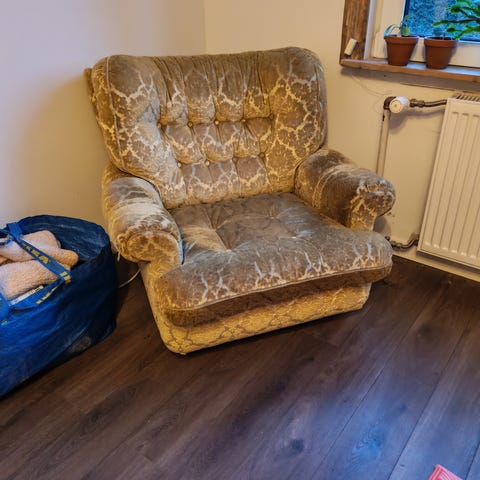 Lepotuoli ruskeaa nahkaa. Jalkatuki tulee esiin kun sivun linkun vapauttaa ja selkänoja menee samalla halutessasi makuuasentoon jolloin syvyys on 170cm. Ympäripyörivä. Kuljetus järjestyy tarvittaessa lähialueelle.