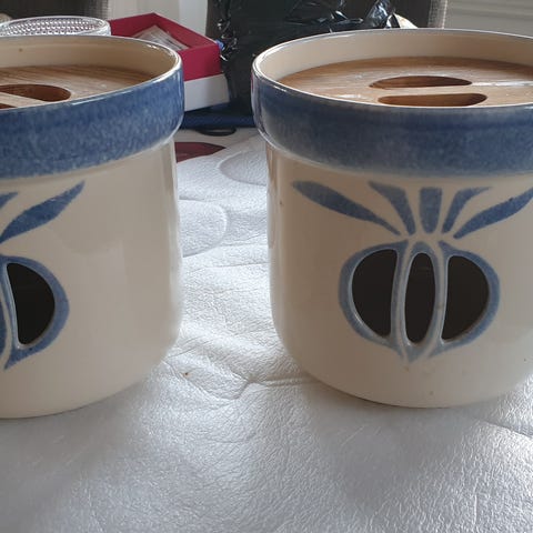 Kaksi keraamista Pentik-sipulipurkkia. Suuremman purkin halkaisia on 16 cm ja korkeus 15 cm. Pienemmän purkin halkaisia on 13 cm ja korkeus 12 cm.
