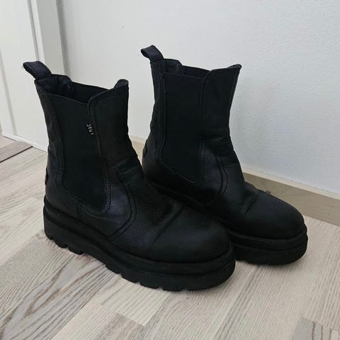 Ihanat, korkeat nilkkurit. Vetoketju sisäsyrjällä, joten helppp pukea. Pehmeää, mokkanahan tyylistä mattapintaista kangasta, pysyy käytössä siistinä mutta kerää pölyä kenkähyllyssä. Kuvissa siis hieman pölyiset, itse kangas on siisti.