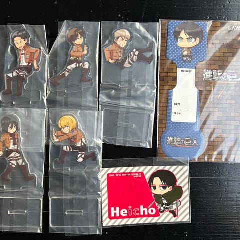 Setti Shingeki no Kyojin-oheistuotteita. Kaikki uusia, alkuperäispakkauksessa. Hinta setiltä, voidaan myydä myös erikseen ao. hinnoin: