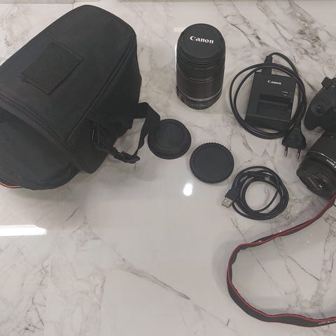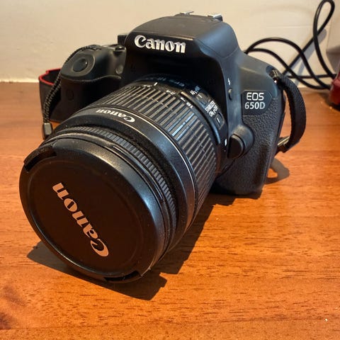 Canon EOS 650D ja Canonin objektiivit 18-55mm + 55-250mm. Vuosia vanha, nyt ei ole ollut aktiivisessa käytössä useampaan vuoteen. Todella hyvä setti vaikka harrastelijalle :)