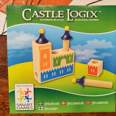 SmartGames logiikkalinna on logiikkapeli, jossa seitsemällä puisella osalla rakennetaan 48 erilaista linnaa. Vuoden lelu 2009 leikki-ikäisten sarjassa. Ollut meillä tosi suosittu. Ohjekirjassa mallit linnojen kokoamiseen. Laatikko hieman kulunut, palikat hyvässä kunnossa.