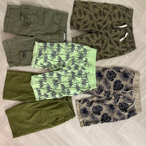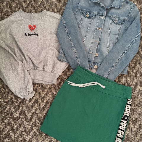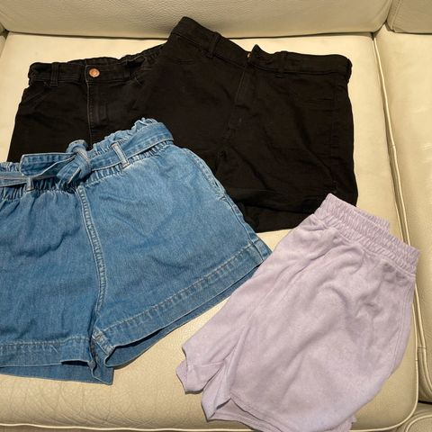 H&M Denim -merkkiset mustat shortsit tytöille, koko 146. Shortsit on valmistettu denimmateriaalista ja ne sopivat lasten käyttöön. Mukana myös valko-tummanvihreä raidallinen t-paita.