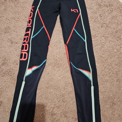 Kari Traa juoksutrikoot naisille, koko XS. Tummansiniset trikoot, joissa on vaaleanpunaisia ja valkoisia yksityiskohtia. Soveltuvat juoksuun ja muuhun urheiluun.
