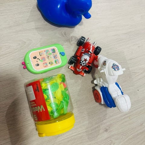 - Fisher Price palikkapurkki ja palikoita 7 kpl. 3€