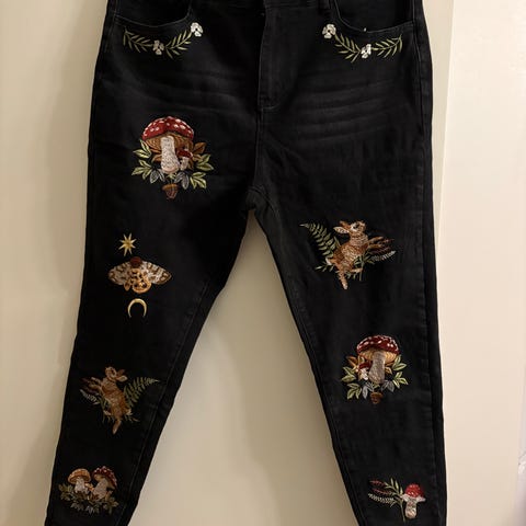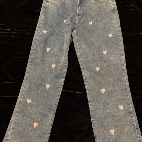 En muista, onko näitä kertaakaan edes käytetty. 99% puuvilla, 1% elastaani, pesu 40 astetta. Vyötärö 96 cm, lahkeen pituus 75 cm, lahkeen leveys alhaalta 20,5 cm.