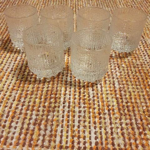 Iittala Ultima Thule snapsilasit, 5 kappaletta. Valmistettu kirkkaasta lasista, lasien pinta on kuvioitu jääkuoren kaltaiseksi.