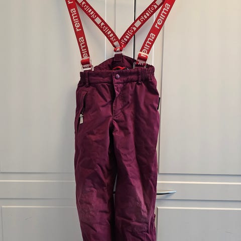 Lasten henkselimalliset vedenkestävät Remu- toppahousut vetoketjulla. Polvessa pientä nirhaumaa, ei läpi asti, pitää kosteuden. Muutoin kuin uudet, koko 116.