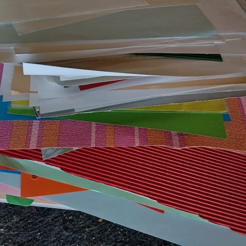 Kuteista virkattu pieni matto, trikookuteita ja puuvillakangaspaloja.