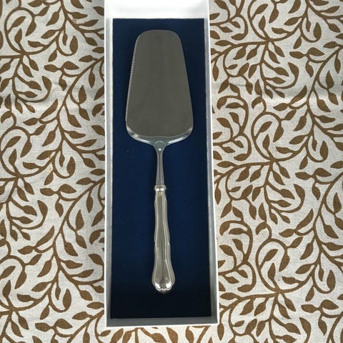 Vanha hopeinen 185 mm pitkä leivoslapio, paino 28 grammaa, valmistettu 1963 (leima K7), hopean leima 813H ja valmistajan kotkanpääleima = Auran kultaseppä Oy. Kaiverrus 7.3.64.