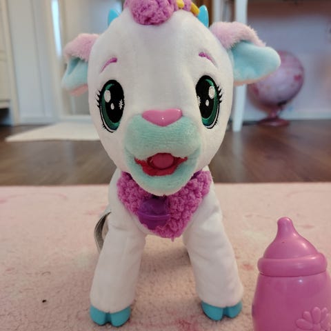 Interaktiivinen vuohi joka ääntelee ja nousee jaloilleen, kun sitä juottaa.