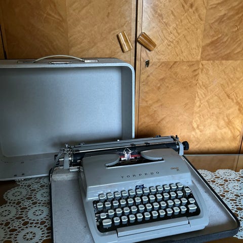 Mekaanisesti toimiva kirjoituskone. Ei värinauhaa. Ikä on arvoitus, 70-85 vuotta vanha.