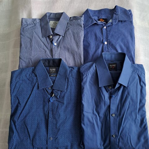 Pakettina neljä m kokoista kauluspaitaa. Kaikissa pitkät hihat. Musta liivi, taskut avaamatta. Valkoinen ja Sini-harmaa kravatti. Oikein siistejä kaikki, vain ryppyisiä säilytyksestä.