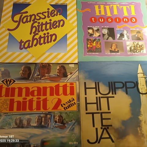 Kesähitti, kesähitti 2, hittiparaati 1 ja hittiparaati 3. Kolmosen kansi pahvi on kulunut mutta levy hyvä. Myyn toki myös erikseen, mutta jos ostat kerralla useamman muunkin levyn, niin saadaan kyllä hintaakin sorvattua alaspäin