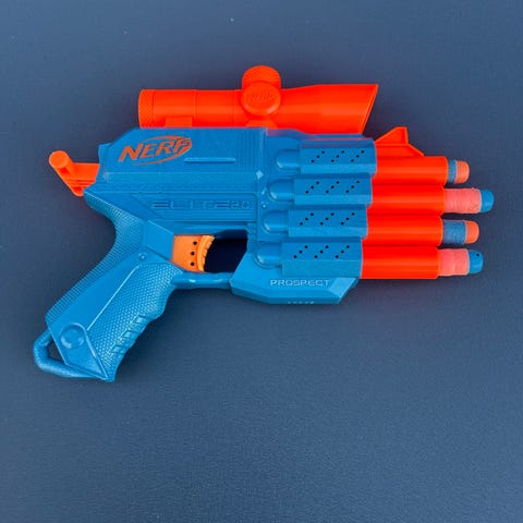Kaksi kpl toimivaa paristokäyttöistä Nerf Phoenix pyssyä. Yksi panospesän suojakuori puuttuu, mutta ei haittaa käyttöä.