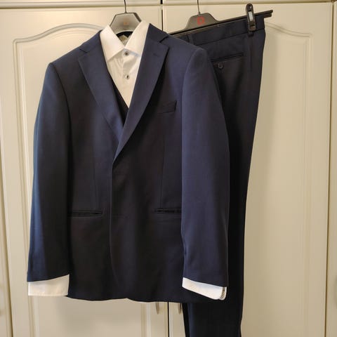 Myydään nuorelle rippipuvuksi ostettu dressmannin tummansininen Wool Stretch-puku. Takin Koko 46 Regular slim fit.