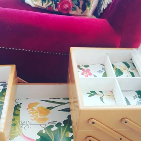 Hienokuntoinen vanha ompelulaatikko, korkeus 35cm, halkaisija 40cm.