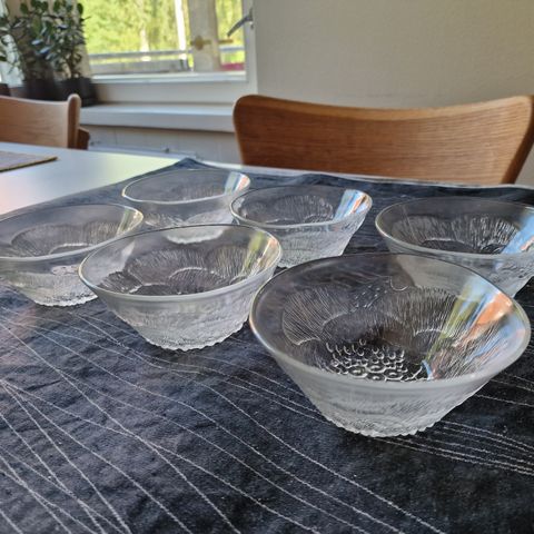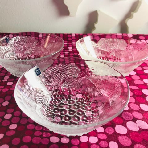 Oiva Toikan suunnittelemat Pioni-jälkiruokakulhot. Halkaisija 12 cm. Hinta 10 €/kpl. Nouto Helsingin Kampista.