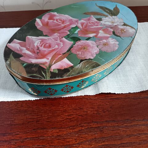 Vanha punainen arkun mallinen peltirasia, jossa sametti pinta. Ei lokeroita sisällä .