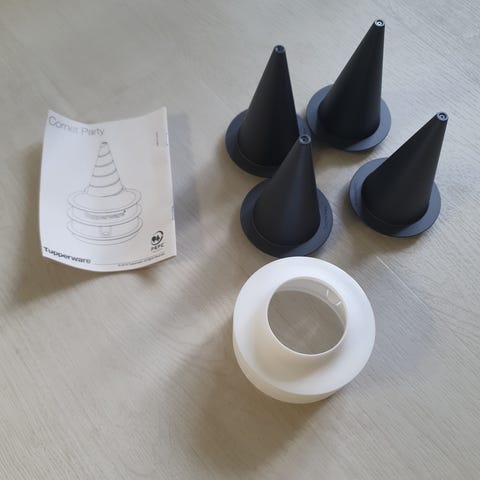 Tupperwaren Cornet Party setti, jossa on Ultra Pro-materiaalista tehtyjä kartioita. Tötteröillä voi valmistaa esim. makeita ja suolaisia tötteröitä. Muotit kestävät uunin, mikroaaltouunin, jääkaapin ja pakastimen.