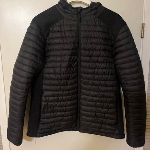 Musta naisten polveen asti ulottuva kevyt toppatakki, koko L.