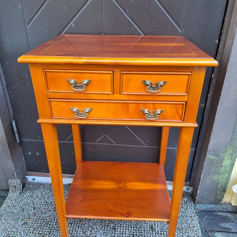 40-50 luvun Pöytä laatikolla ja alatasolla, leveys/syvyys 64/37cm, korkeus 58cm.