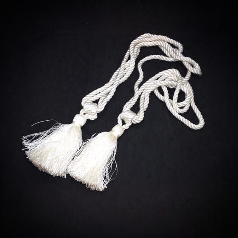 Luonnonvalkoista kiiltelevää (silkkimäistä) köyttä ja tupsut.Köysi/lenksuraosien pituus on 32 cm.