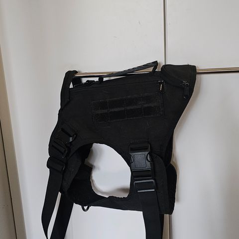 Punaiset valjaat noin 15-20 kiloiselle koiralle. Olleet sekarotuisella, jossa Suomen pystykorvaa ja Lapinkoiraa. Talutin 3m ja 2cm leveä ja pusseille pussukka. Heijastinta valjaissa ja taluttimessa.