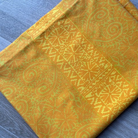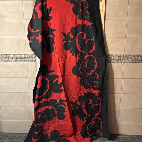 Marimekon pöytäliina tai verho. Ommeltu Marimekon myymälässä. Tankokuja tai nipsukiinnitys.