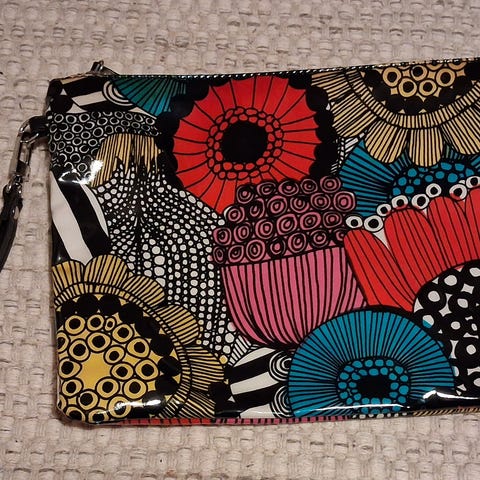 Myyn Marimekon clutch bagin. Kunto on hyvä ja väri on tummaliila, sisältä pinkki. Livenä, ulkona värit näyttää paremmalta. Tää sopii juhlatilanteeseen ja toimii isona meikkilaukkunakin.