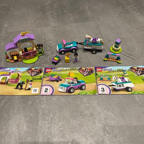 Lego Friends - Ratsastusvalmennus ja traileri (41441) setti. Kertaalleen koottu ja vähäisissä leikeissä ollut. Ohjekirjaa ei löydy enää. Mielestäni osien pitäisi olla tallessa, mutta yksi omena kyllä puuttuu. Tilalle on laitettu porkkana.