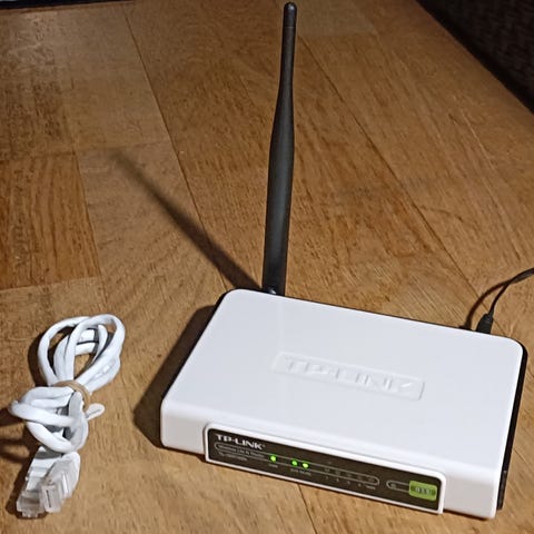 TP-Link reititin, jossa on kolme antennia. Mukana virtalähde. Laite soveltuu langattoman verkon jakamiseen kotikäytössä tai pienessä toimistossa.