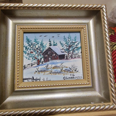 Lapinkairan (Nikolai Kautiainen 1908-1993) kaunis maisemamaalaus vuodelta 1990. L 77cm × K 66,5cm × S 3,5 + 1,5 cm (taustassa näkyvä pingoituskehys on syvempi kuin varsinainen kehys). Maalaus ja kehykset erittäin hyvässä kunnossa, ainoa vika kuvassa näkymä lohkeama kehyksen alareunassa, joka ei taulun seinällä ollessa näy.