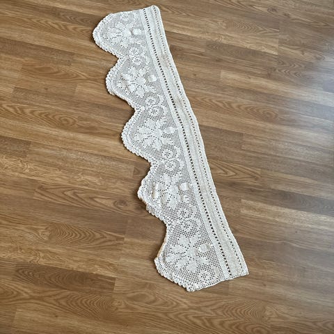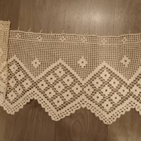 Mummon virkkaama uusi pitsiverho jossa ylhäällä pieniä lenkkejä tangolle tai nipsuttimille. Virkattu kala langasta.