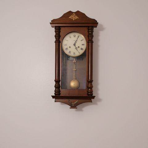 Seinäkello, jossa puinen kehys ja lasinen etuseinä. Kello sisältää painot ja heilurin. Perinteinen mekaaninen kello, jossa näkyvät numerot ja osoittimet kellotaulussa. Vaatii huollon