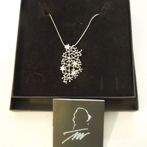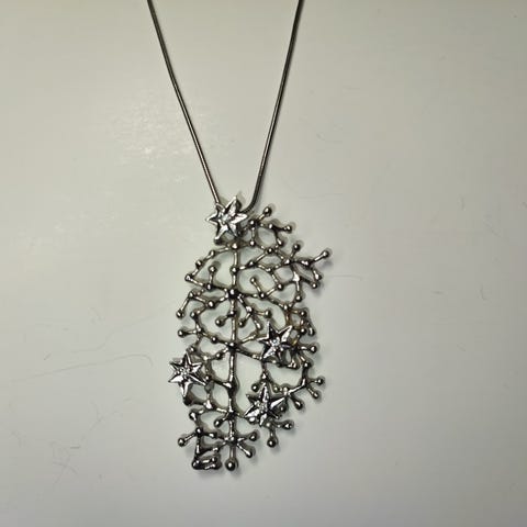 HOPEINEN kaulakoru Design Tapio Wirkkala UUSI alkuperäispakkauksessa (alkuperäinen rasia ja aitoustodistus), KETJU ja RIIPUS - HOPEA 925 ,kultaus, Riipuksen koko on 55 x 32 mm, ketjun pituus 47cm. Riipuksen tähtien keskellä on 4 läpinäkyvää kristallia.