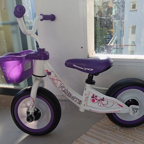 Kolmipyöräinen potkupyörä, jossa takana kävelytuki/selkänoja. Erittäin tukeva, pysyy pystyssä. Hyvä kävelyä ja kehonhallintaa opettelevalle taaperolle, kun ei ole vielä kovin pitkiä matkoja tarkoitus edetä.