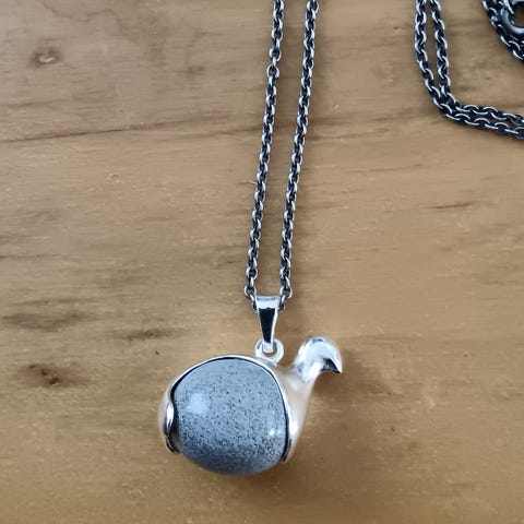 Koko noin 26 x 18 mm, paino ketjuineen 15,4 g. Hopeaketjussa leimat PTn, kruunu, 925.