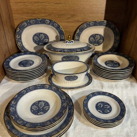 Setissä on 7 matalaa ruokalautasta, 8 isoa syvää lautasta ja yksi pienempi syvä lautanen.