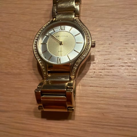 Materiaali: Kullanvärinen messinkirunko ja ruostumattomasta teräksestä valmistettu takakansi. Kullanvärinen joustava ranneke (dublee).