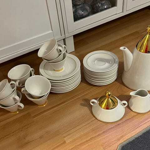 Erittäin hyvässä kunnossa oleva astiasto. Kultaus kauniisti hohtaa, ei kulumia. Isot lautaset 8kpl Kuppeja 7 kpl. Tasseja ja kahvikupin alustoja 8 kpl. Sokerikko ja kermakko. Myydään myös erikseen. Tarjoa hintaa.