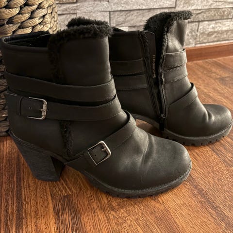 - Kengät ulkopuolelta hyväkuntoiset. Sisältä pehmeä vanukerros on kulunut kantapäiden kohdalta. Niitä on vahvistettu liimaamalla teddypaikat jälkikäteen. Toinen nauhoista on kulunut. Pohjat kunnossa.