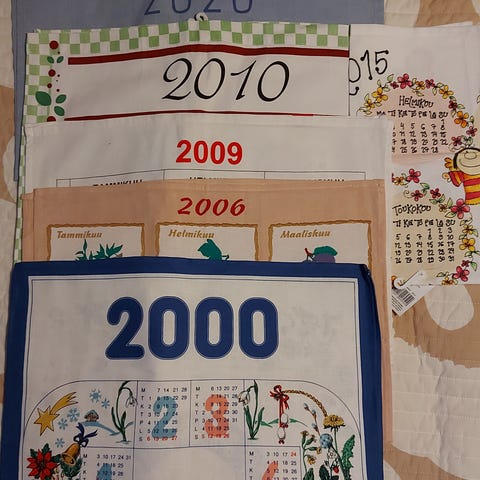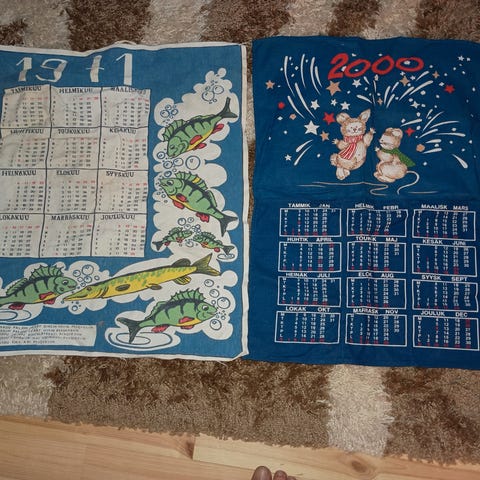 Eri vuosilta hyväkuntoisia, puhtaita kalenteripyyhkeitä. Voi ostaa erikseen tai kaikki kerralla. Hinta: v.-76 pyyhe 10e sekä v.2000 pyyhe 10e. Muut vuosipyyhkeet 5e kpl. Saatavana pyyhkeet vuosilta -81, -82,-83,-92,-94,-02,-03, -05, ,-08,-09
