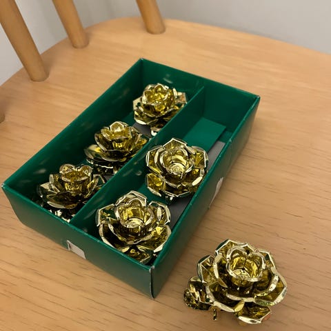 Joulukoristeet on päällystetty 24 karaatin kullalla. Koristeisaa on kullanväriset narut ripustamista varten.