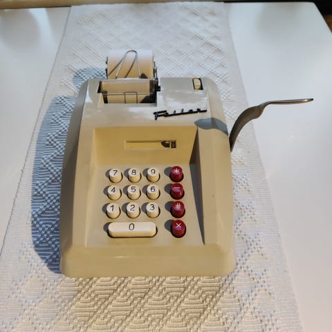 Ei ole paperia, mutta vaikuttaa toimivalta? Kun syöttää lukemia ja veivaa kammesta niin kassalipas aukeaa. Nollausvipu nollaa valinnat ja lukemat.