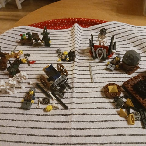 -’Minifigut vähän kuluneempia. Maalit kuluneet ja jalat osalla vähän löysiä. Yhdellä torsossa halkeama sivulla. Sulat puuttuvat kaikilta, 2 sinistä ukkoa puuttuu, yhdeltä puuttuu hattu ja nuoliviini ja kaikilta jouset. Ei ohjeita eikä laatikkoa