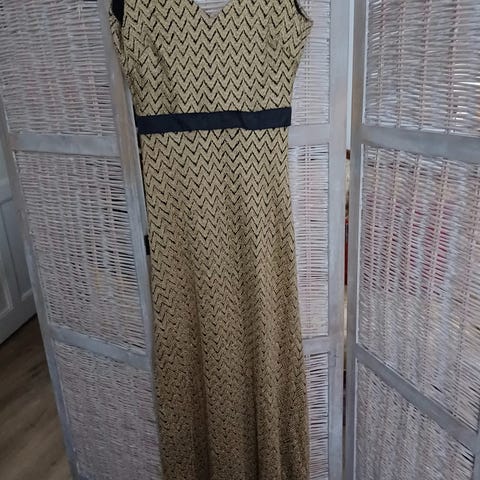 Naisten ilta- tai juhlapuku, koko M, väriltään kulta. Valmistettu paljeteista, sopii naisten käyttöön juhla- ja iltatilaisuuksiin. Mekossa on halkio ja ristiin solmittava selkäosa. Todella kaunis mekko, jäänyt käyttämättä. Nouto myös onnistuu Turun keskustasta. Vastaa kokoa M-L