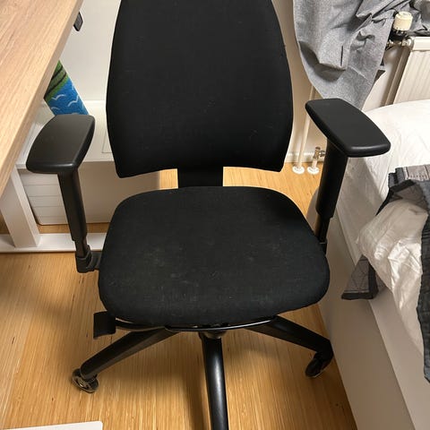 Kinnarps toimistotuoli mustalla kankaalla. Tuolissa on metallirunko ja pyörät. Sopii toimistokäyttöön ja tarjoaa perusistumismukavuutta. Hinta yhteensä 300€.