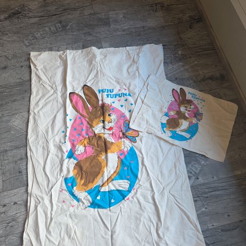Hyväkuntoisia, siistejä ja ehjiä petivaatteita. Pupu Tupuna peitto , 2 pussilakanaa, 1 tyynyliina ja 1 valkoinen tyynyliina sekä tyyny.